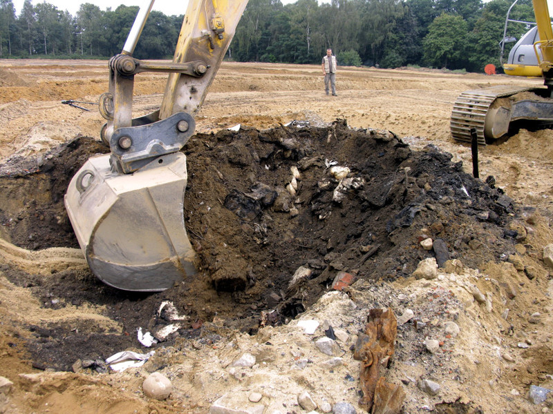 Aus der langjährigen Nutzung des Depots blieben unliebsame Hinterlassenschaften: 257 verfüllte Bombentrichter, 35 Kontaminationsflächen und lokal oberflächennahe Verfüllungen. Die Bodensanierung wurde durch das Sachverständigenbüro Dr. Skowronek geplant, koordiniert und durch einen Sach­­verständigen nach § 18 BodSchG des Büros überwacht. Alle kartierten Bom­bentreffer wurden unter Überwachung des Kampfmittelräumdienstes und des Sachverständigen geöffnet, schadstoffhaltige Verfüllungen ausgeräumt, Waffen, Mu­nition sowie Bombenreste geborgen. 14 % der Bomben­trichter enthielten Kriegsmaterial, 29 % kontaminationsver­dächtiges Material. Skurrilste Funde: Ein komplettes Pferdeskelett und eine Apotheke mit vollen Arzneimittelflaschen.